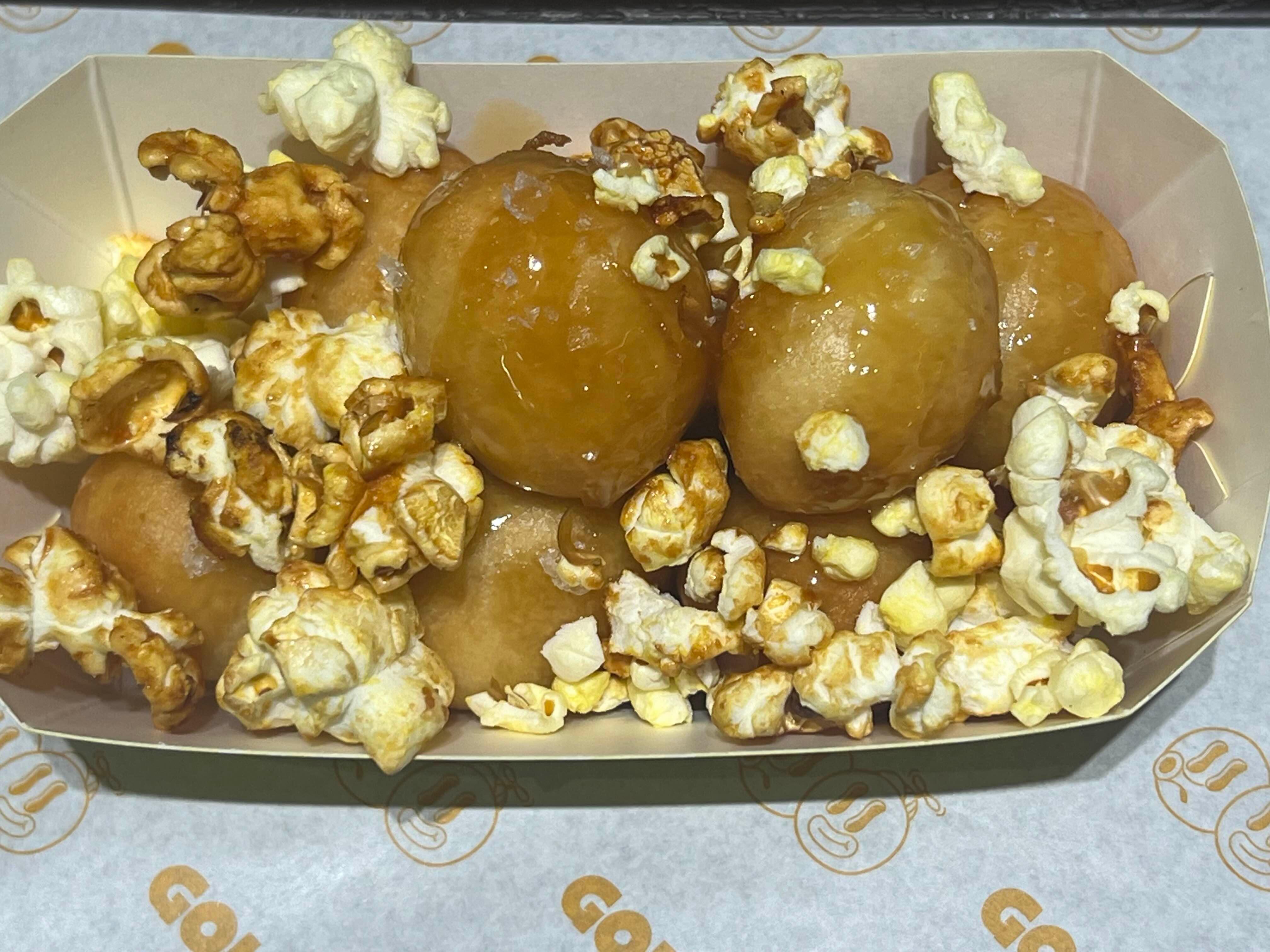 짜잔! 솔티드캬라멜 도넛이다. 볼 도넛이어서 그런지 한 입에 들어갈 만한 크기로 동그랗게 도넛이 되어있었고 위에는 캬라멜이 뿌려져있었다. 옆에는 달달한 팝콘도 붙어 있어서 맛있었다. 마라탕 맛이 강한데 후식으로 혀를 중화해줄 만한 달달함이었다. 볼 도넛이라 손에도 묻지 않고 한 입에 쏙 넣을 수 있어서 아주 먹기에도 좋았다.