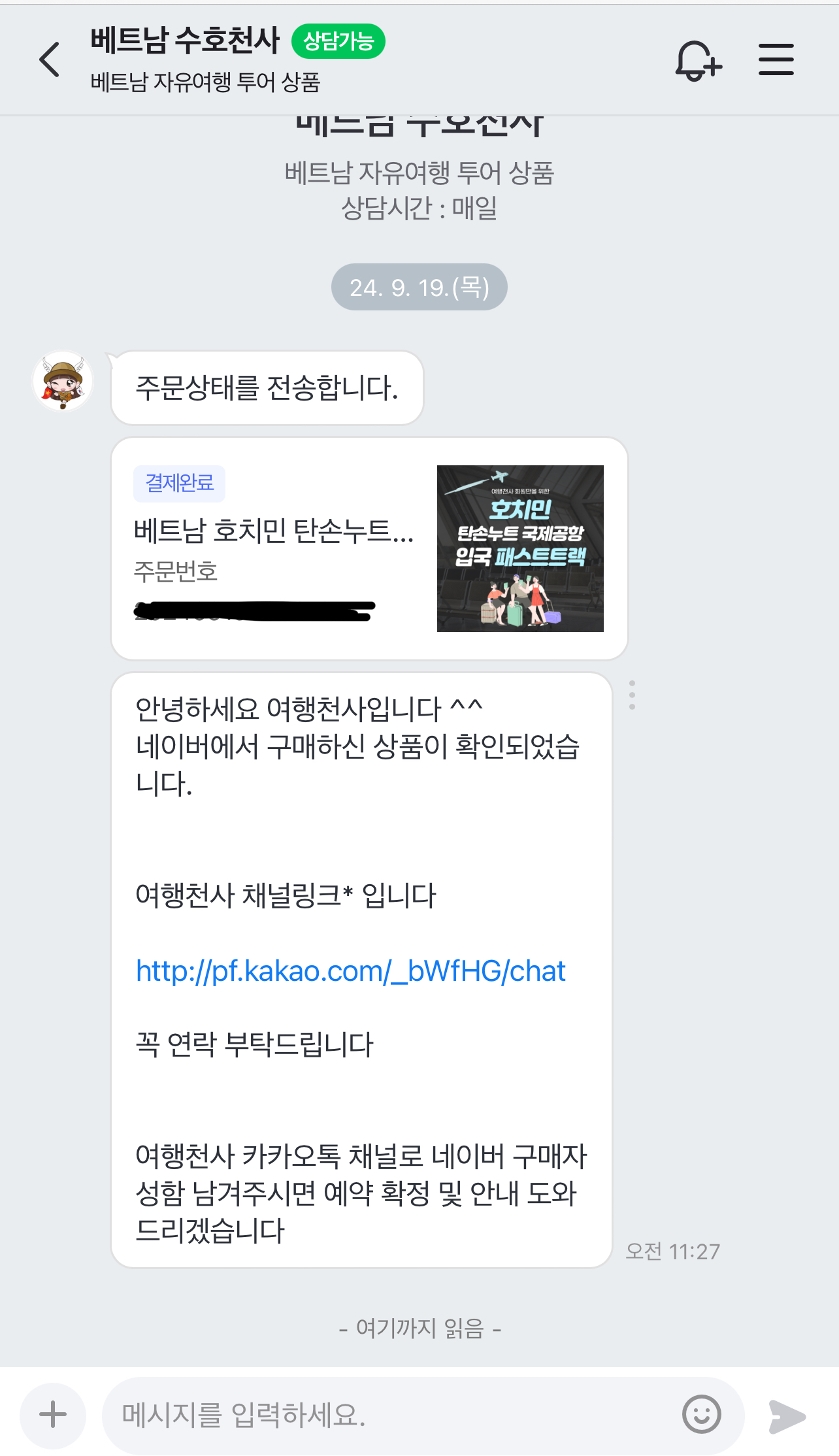 처음에는 해당 네이버 링크를 통해 구매를 했고 구매를 했다고 바로 확정이 아니라, 여행천사 카카오톡 채널을 통해서 구매 확정 카톡을 따로 보내야 한다는 점이다.