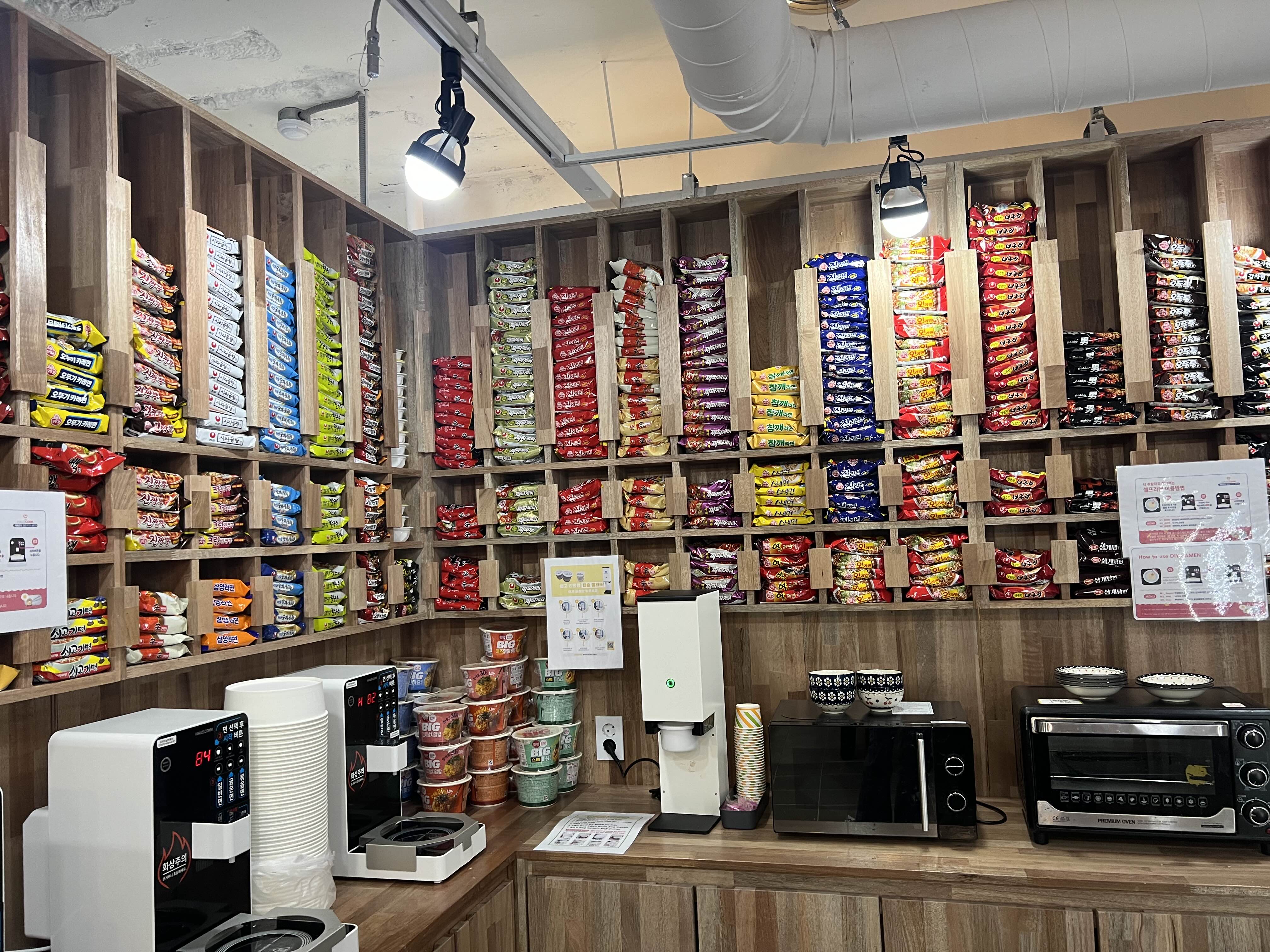 또 좋았던 점은 이렇게 셀프 라면을 먹을 수 있는 공간도 있었다는 점이다. 라면은 추가금액 4000원을 내면 저기 있는 라면 종류에 관계없이 한개를 선택해 먹을 수 있다. 또 라면에 들어가는 토핑은 현재 무료로 제공되고 있는데 오뎅, 계란, 콩나물, 소시지, 떡, 치즈 등 생각보다 토핑이 다양했고 불닭소스, 마요네즈 등 소스도 다양해서 취향껏 먹을 수 있었다.