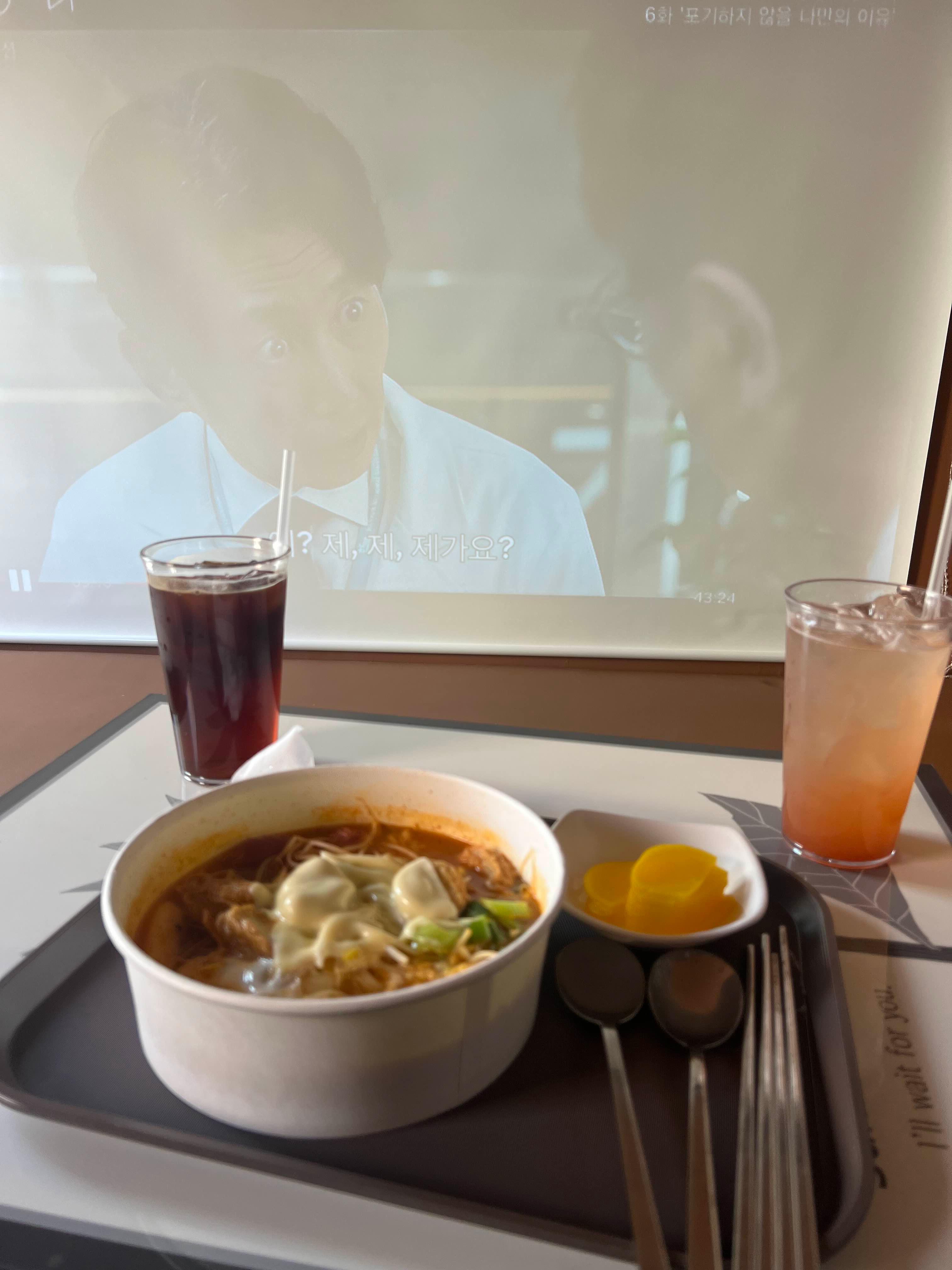 만화책을 볼 수 있는 공간 외에도 OTT룸과 안마의자방, 닌텐도 스위치, 플스를 할 수 있는 방들이 있었다. 안마의자는 한 개 밖에 없어서 조금 아쉬웠고 우리는 OTT룸에 가서 넷플릭스를 열심히 시청해주었다. 우리가 주문한 커피와 우리가 만든 라면을 먹으며 보는 넷플릭스! 생각보다 안에도 넓어서 분위기가 좋았다. 조금 아쉬웠던 점은 밖에 햇빛이 그대로 들어와서 어두운 장면은 잘 보이지 않았다는 점이지만 그래도 재밌게 시청했다.