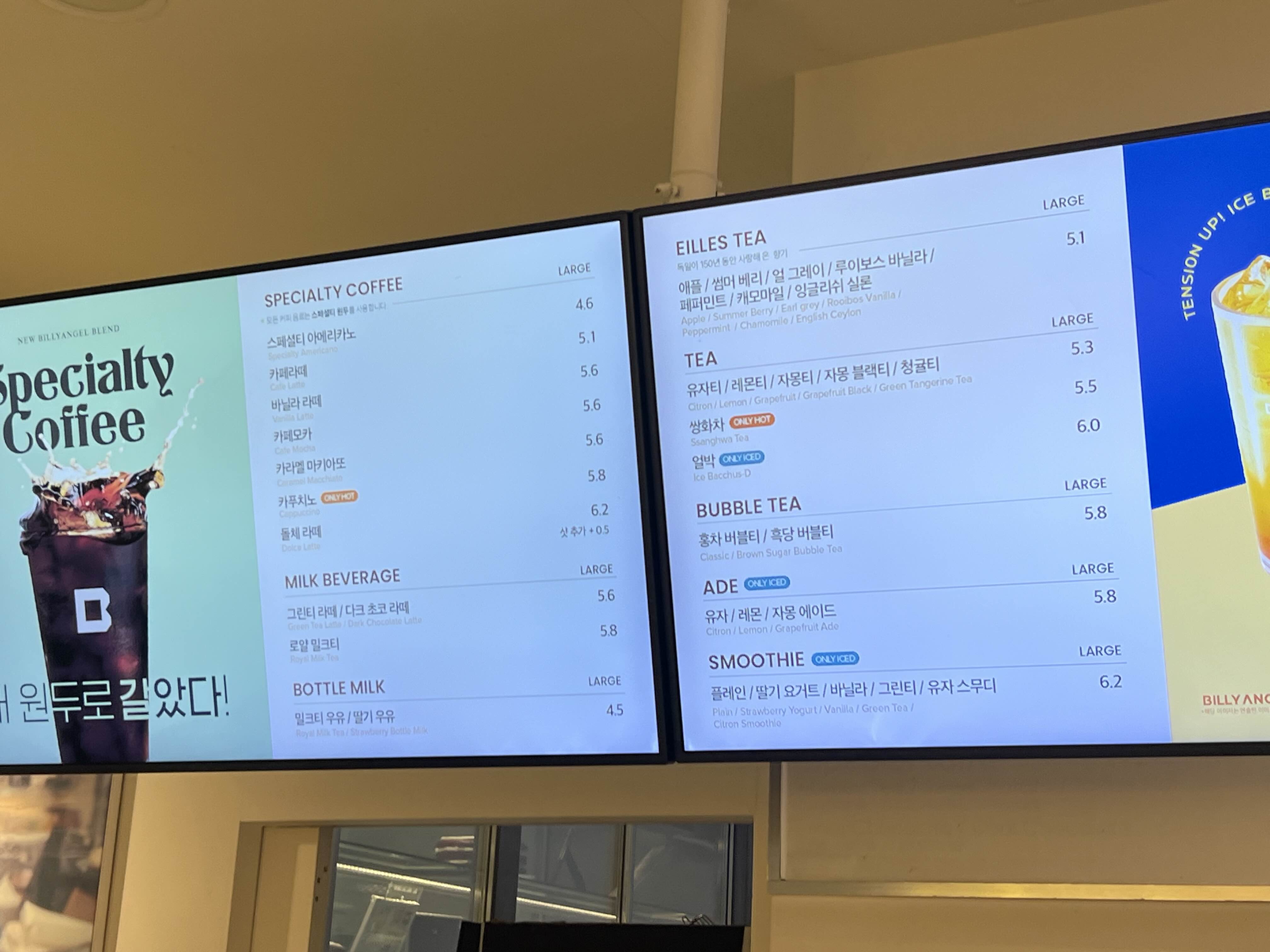 위 사진들처럼 자리가 굉장히 많고 사진에 찍힌 것보다 훨씬 넓은 실내 공간을 보유하고 있다. 생각보다 자리가 편해서 앉아서 노트북을 하거나 태블릿으로 예능 같은 것을 보기에도 좋았다. 다만 빌리엔젤 강남역점은 와이파이 미제공 매장이므로 핫스팟이 꼭 가능해야 할 것!