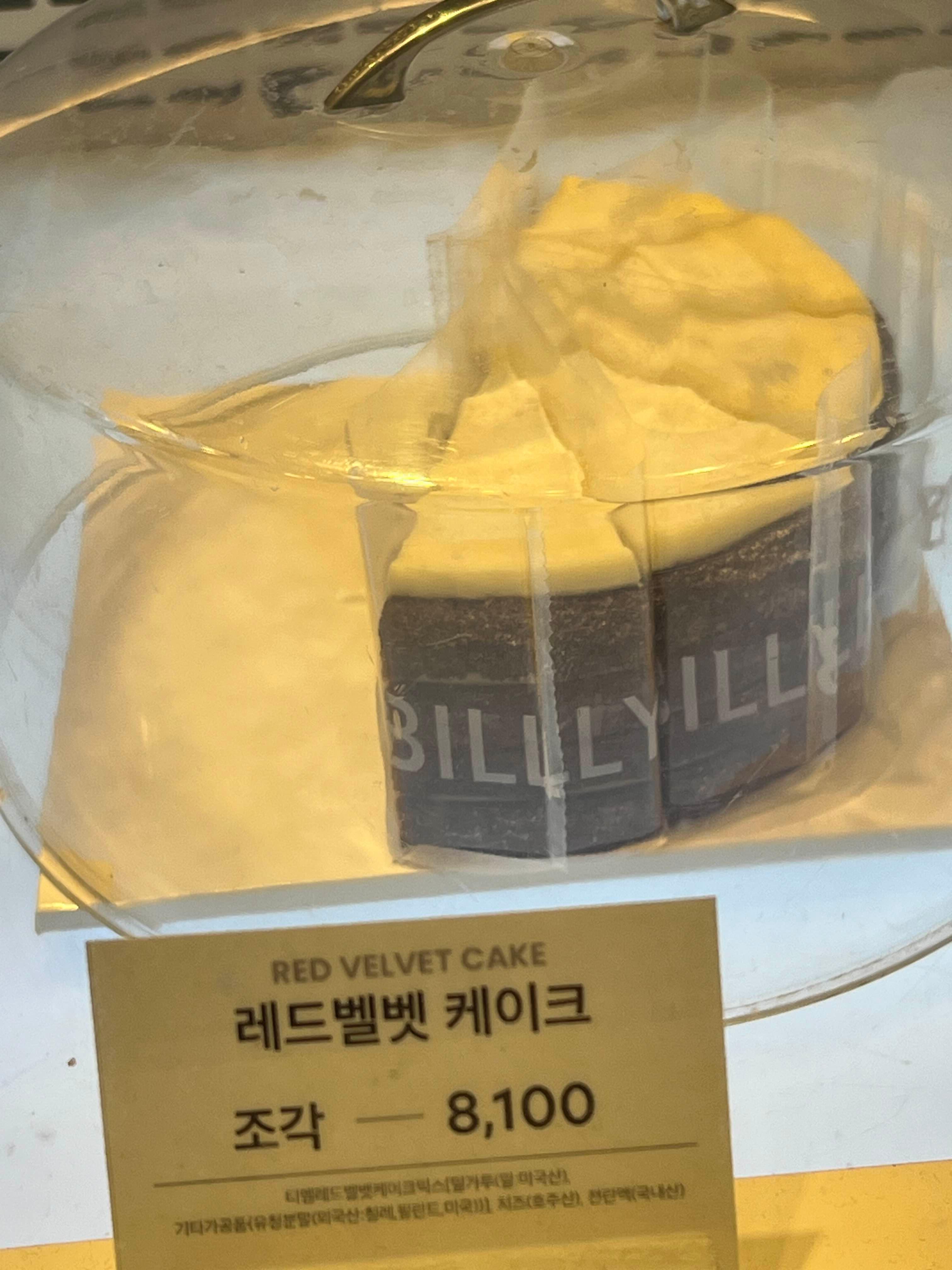 또 빌리엔젤은 이런 케이크로 정말 유명한데, 레드벨벳 케이크가 한 조각에 8,100원, 딸기 크레이프 조각케이크가 7,200원이다. 가격은 비싸지만 그만큼 맛있다고 유명한 케이크들이다. 우리는 저녁을 많이 먹고 간 상태여서 배가 불러 케이크를 따로 주문하지는 않았다.