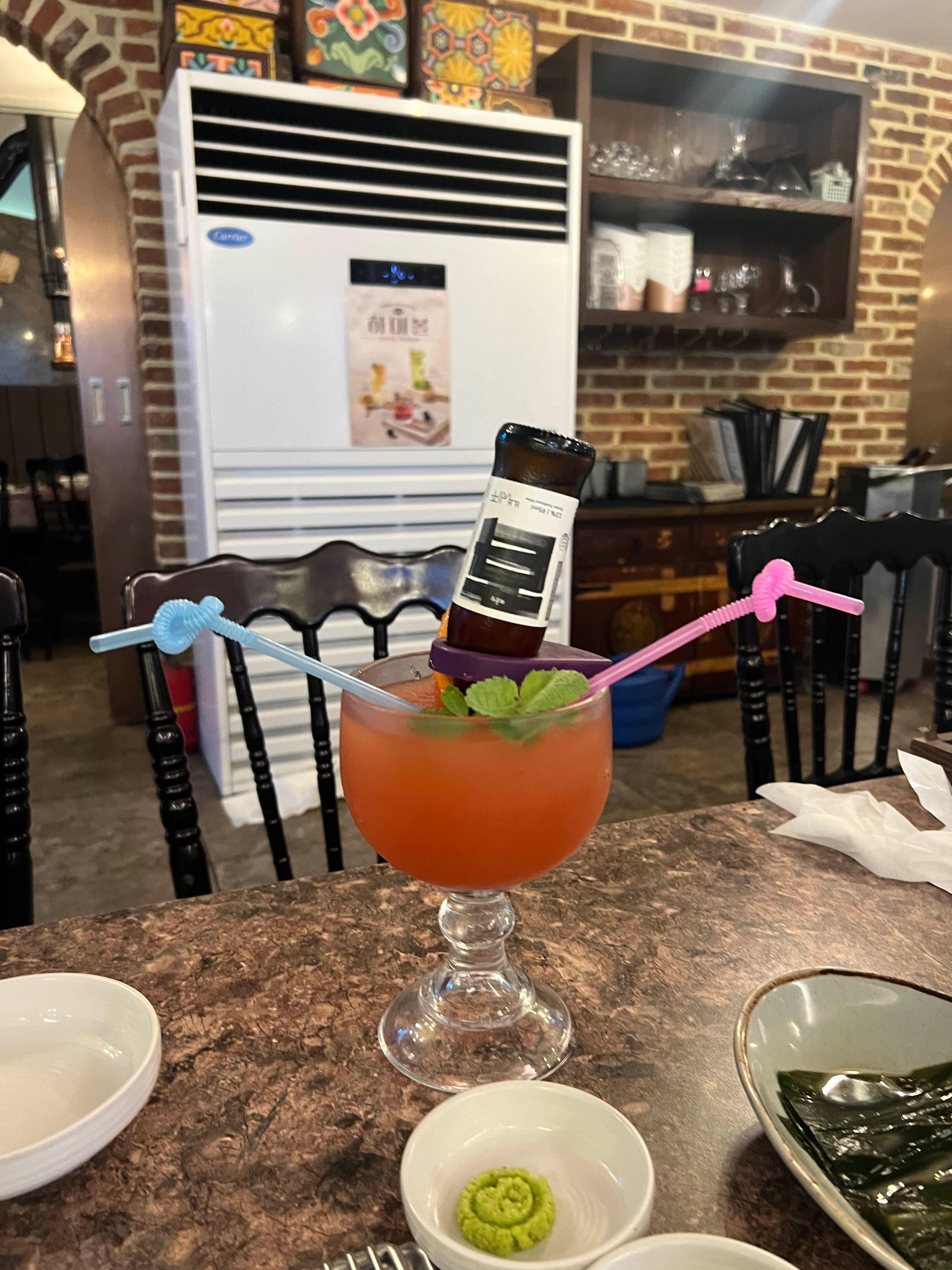 이건 우리가 시킨 백세하이볼이다. 신기하게 위에 술이 꽂아 있어서 천천히 술이 내려온다. 양도 정말 많고 비쥬얼도 예뻐서 돈이 아깝지 않았다. 처음에는 자몽 음료수 같은 맛이 나는데 시간이 지나면서 술이 점점 내려와 술맛이 많이 나는 하이볼이 된다. 상큼하니 갈비와도 정말 잘 어울렸다.