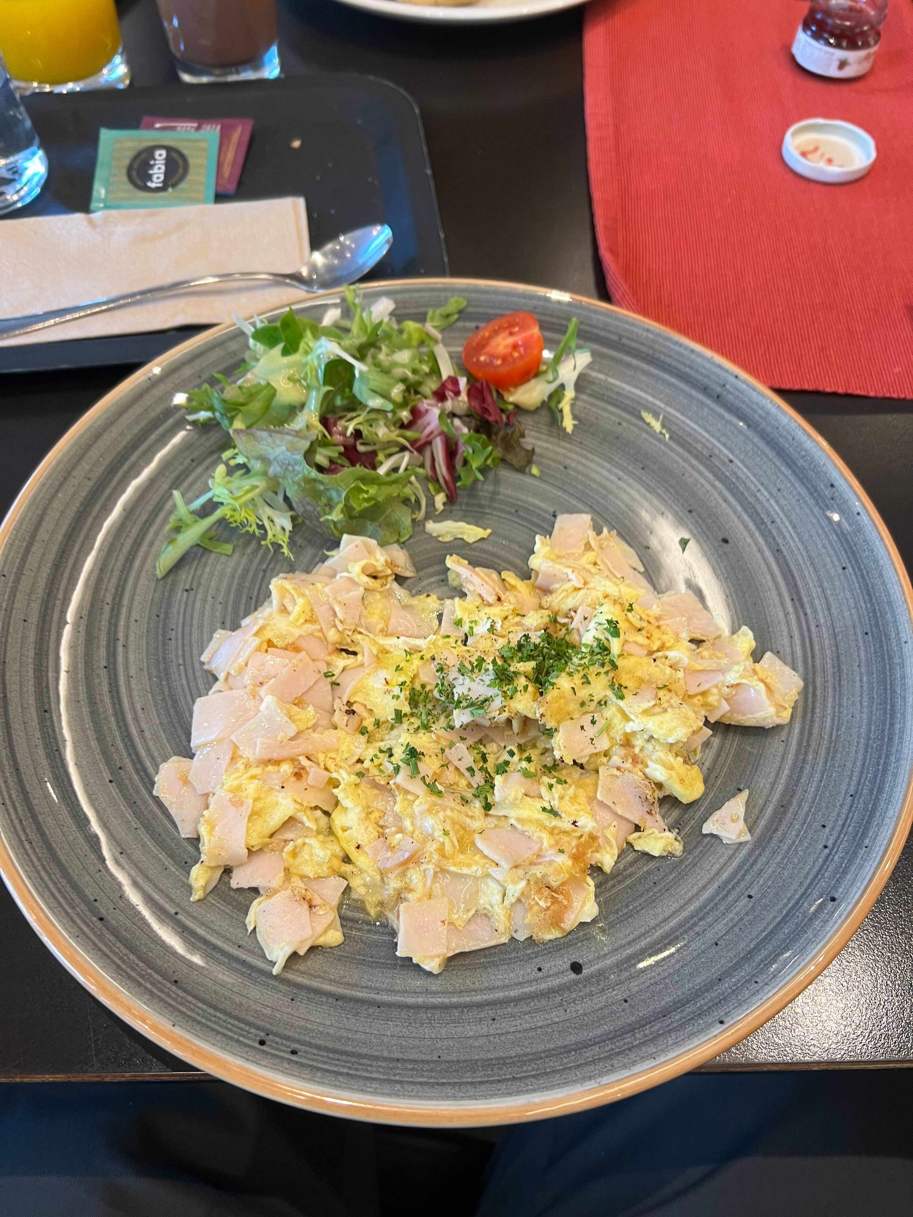 아침은 8시부터 11시까지 주문 가능하고 세트 메뉴로 N1과 N2가 있는데 우리가 주문한 것은 N2 (17.4유로)이다.