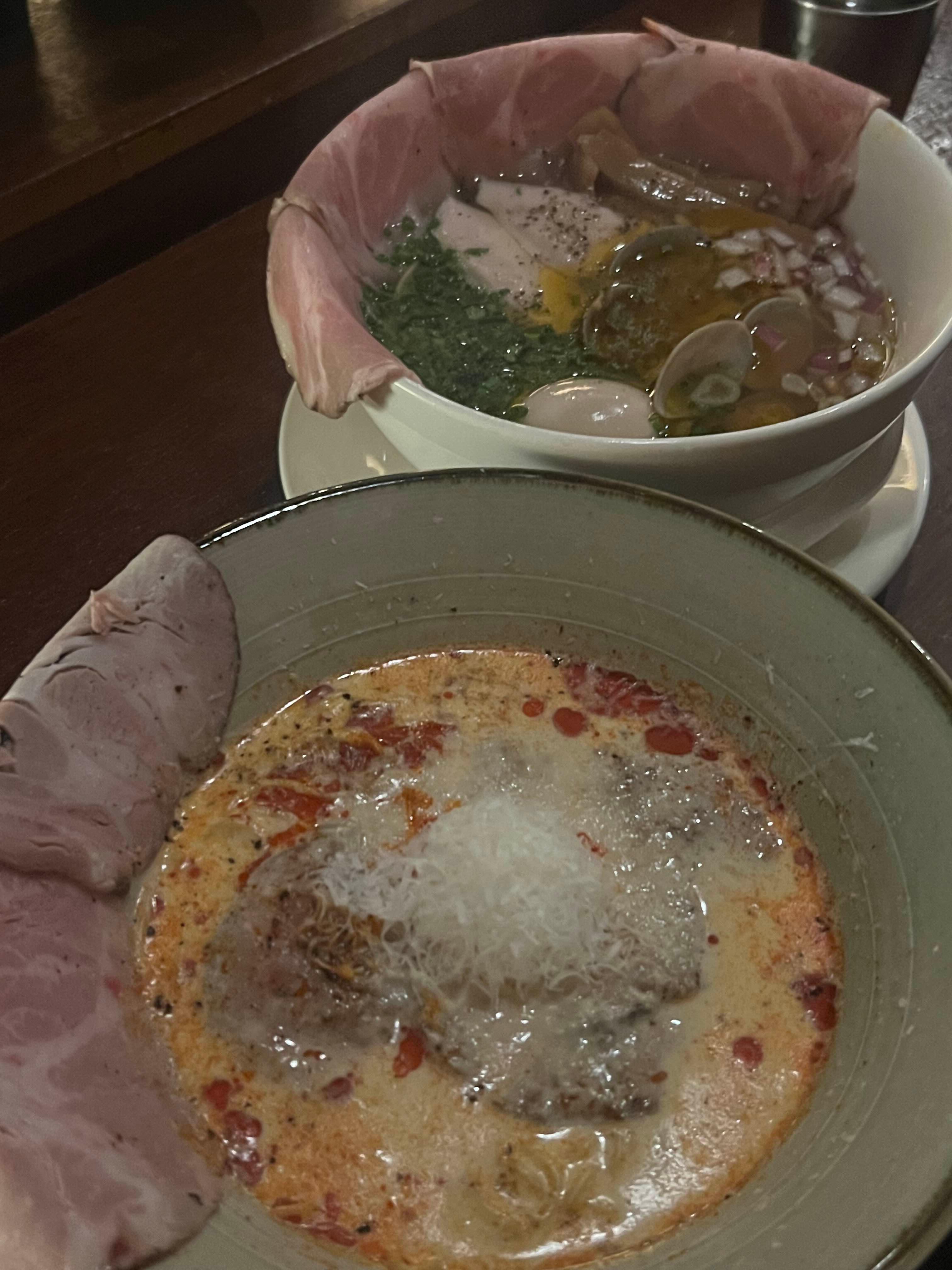 왼쪽이 까르보 프로마쥬 라멘, 오른쪽이 봉골레 소유라멘이다. 까르보 프로마쥬 라멘은 매콤한 까르보 불닭 느낌의 독특한 라멘이었다. 적당히 매콤하면서도 너무 과하지 않고 크리미해서 정말 맛있었다.