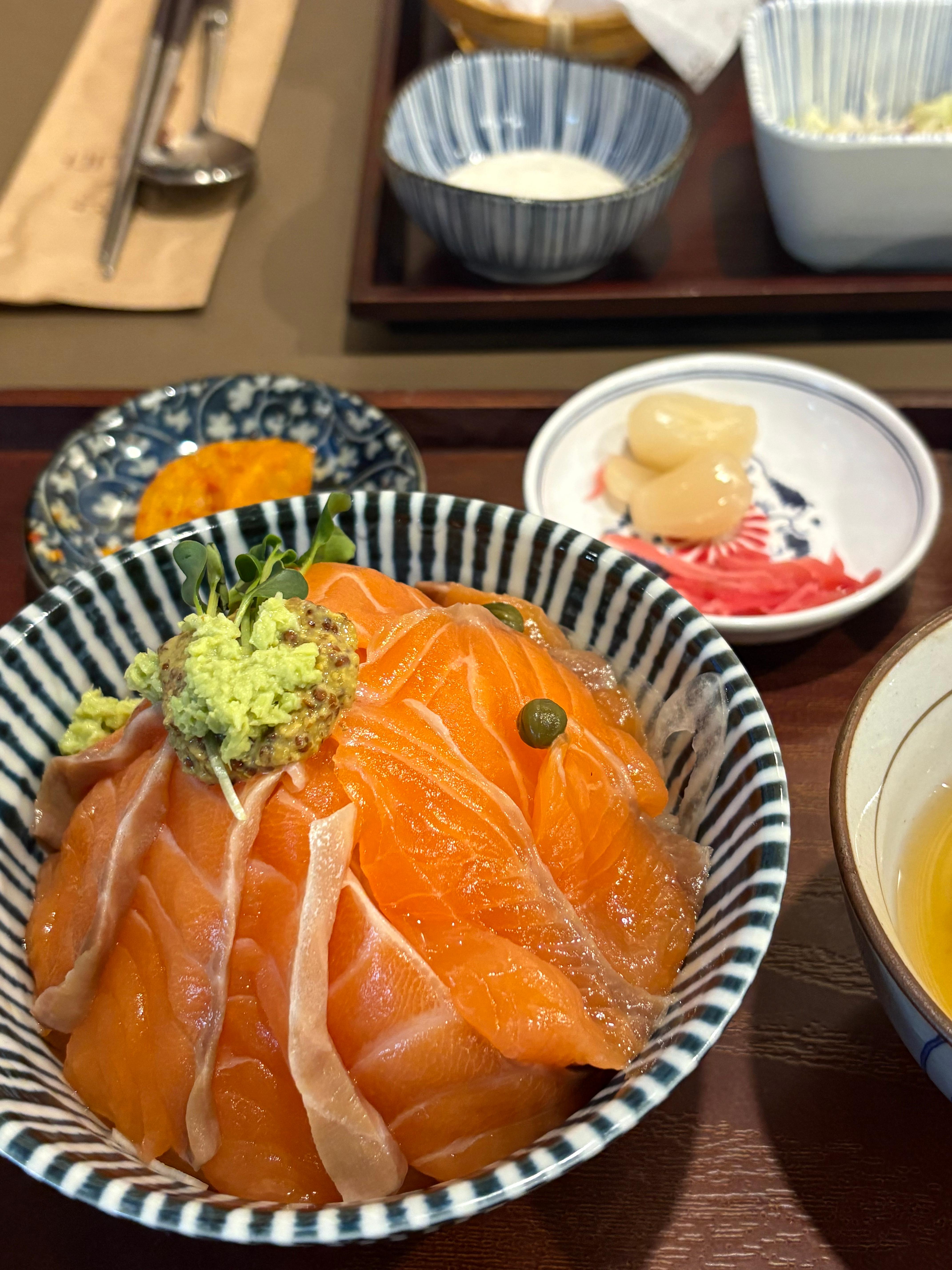 사케동은 생연어가 올라가있는데 연어도 많이 올라가있고 푸짐했다. 가격은 좀 더 있었지만 훨씬 만족스러웠다.