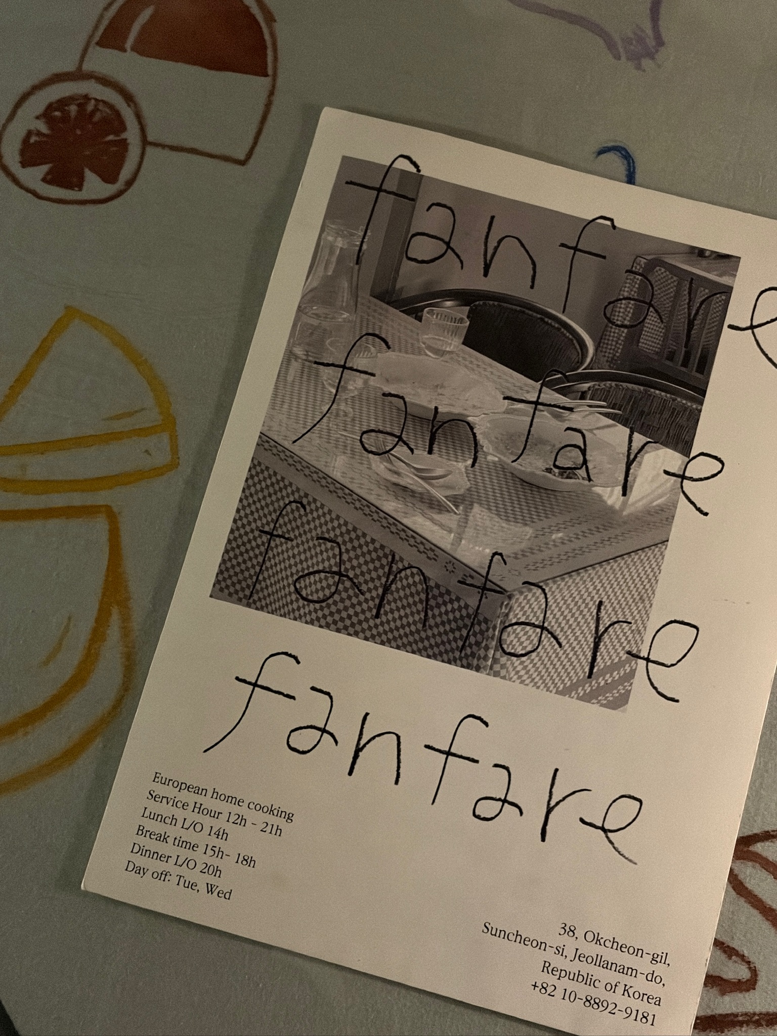 "팡파르"는 순천 옥리단길에 위치해 있으며 카페 1962 골목으로 들어오면 찾을 수 있다. 매주 화요일, 수요일은 정기휴무, 이외 요일은 12:00-21:00 동안 영업한다. 15:00-18:00은 브레이크타임이다.