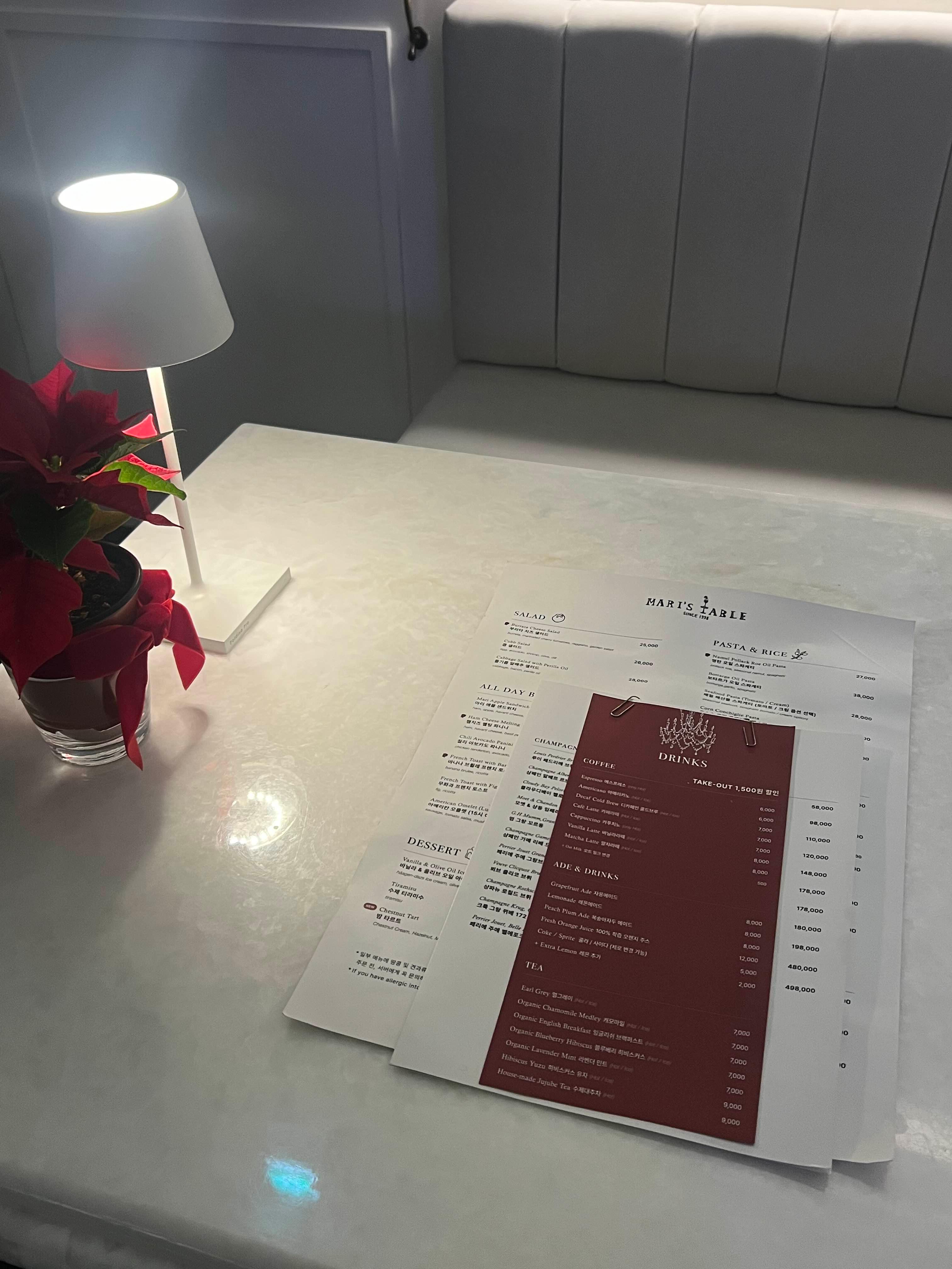 우리는 예약을 미리 하고 갔고, 구석 테이블로 안내받았다. 메뉴판부터 예쁘게 꾸며져있어서 분위기도 정말 좋았다.