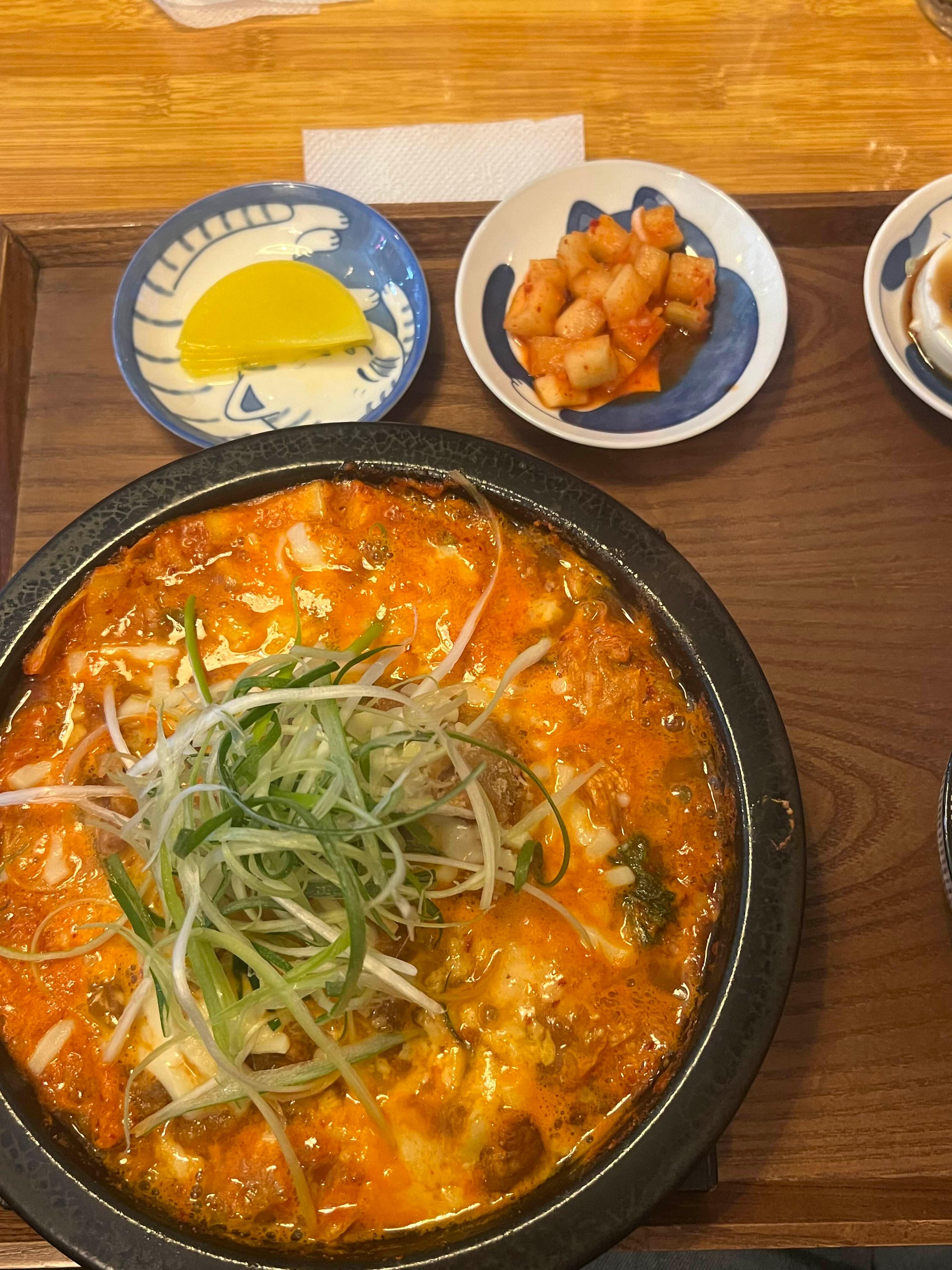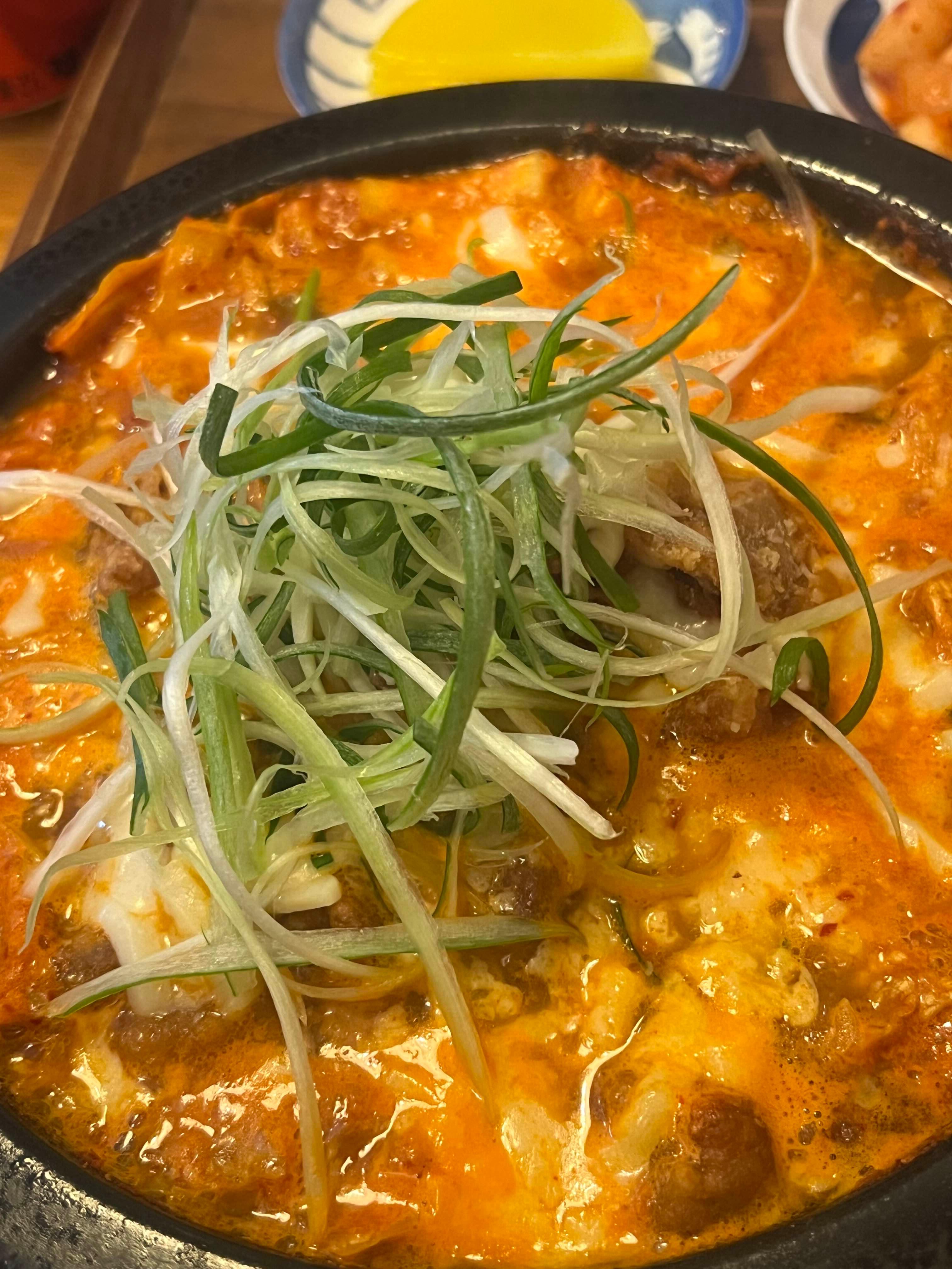 조금 지나지 않아서 우리가 주문한 김치나베가 나왔다. 내가 주문한 김치 가라아게 나베는 안에 가라아게가 꽤나 푸짐하게 들어있고 치즈와 대파가 올라가 있다.