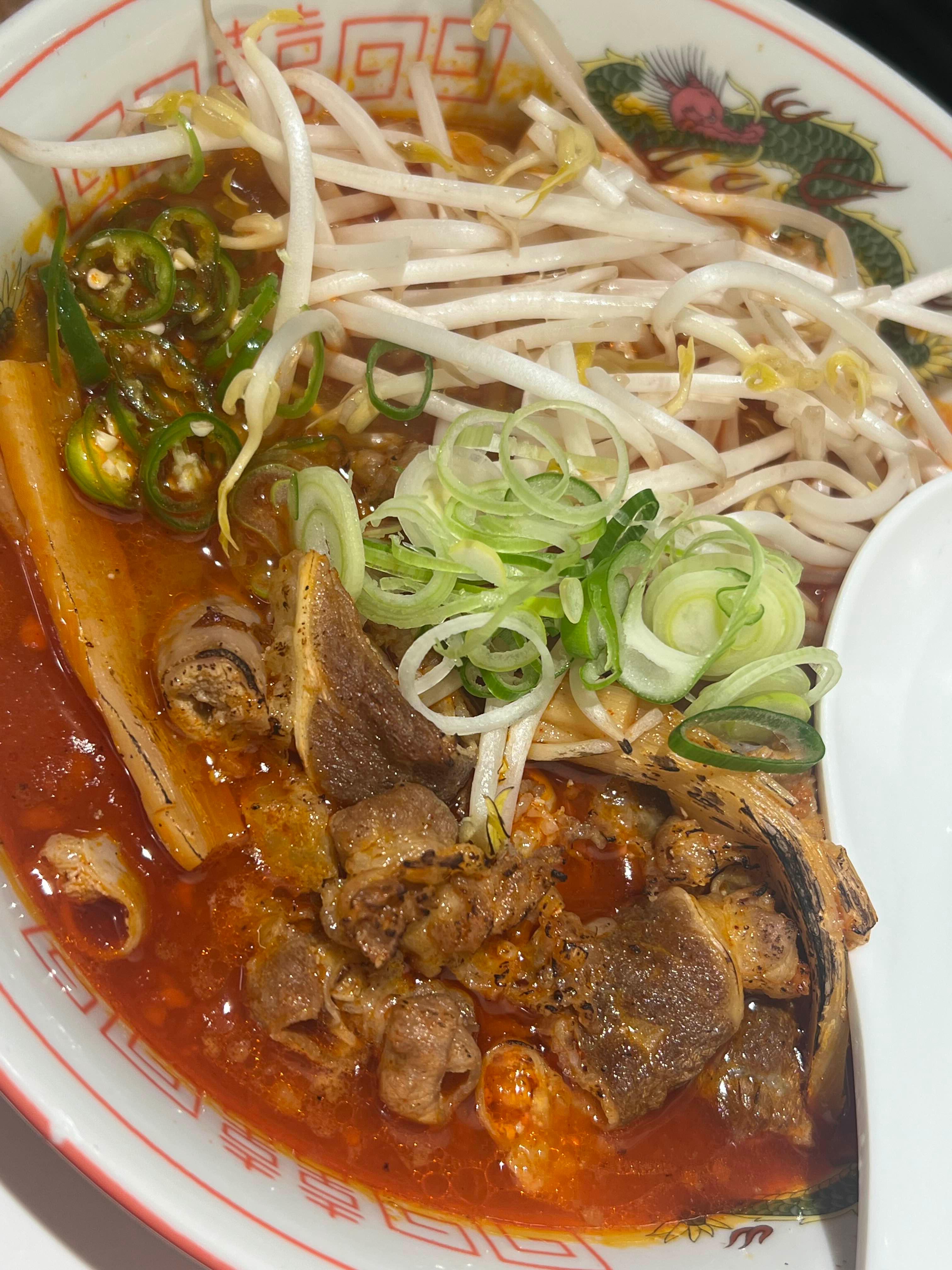이게 바로 모츠라멘 (소곱창 라멘)인데 안에 곱창과 야채가 가득하다. 또 다른 라멘보다 가격대가 있는 만큼 면의 양도 조금 더 많은 것 같다. 곱도 쫄깃하고 육수가 무엇보다 얼큰해서 너무 잘 어울렸다. 시그니쳐 메뉴인 만큼 여기 오신다면 꼭 먹어보는 것을 추천한다. 또 숙주도 잔뜩 들어서 더 다채로운 맛을 내는 라멘이다.