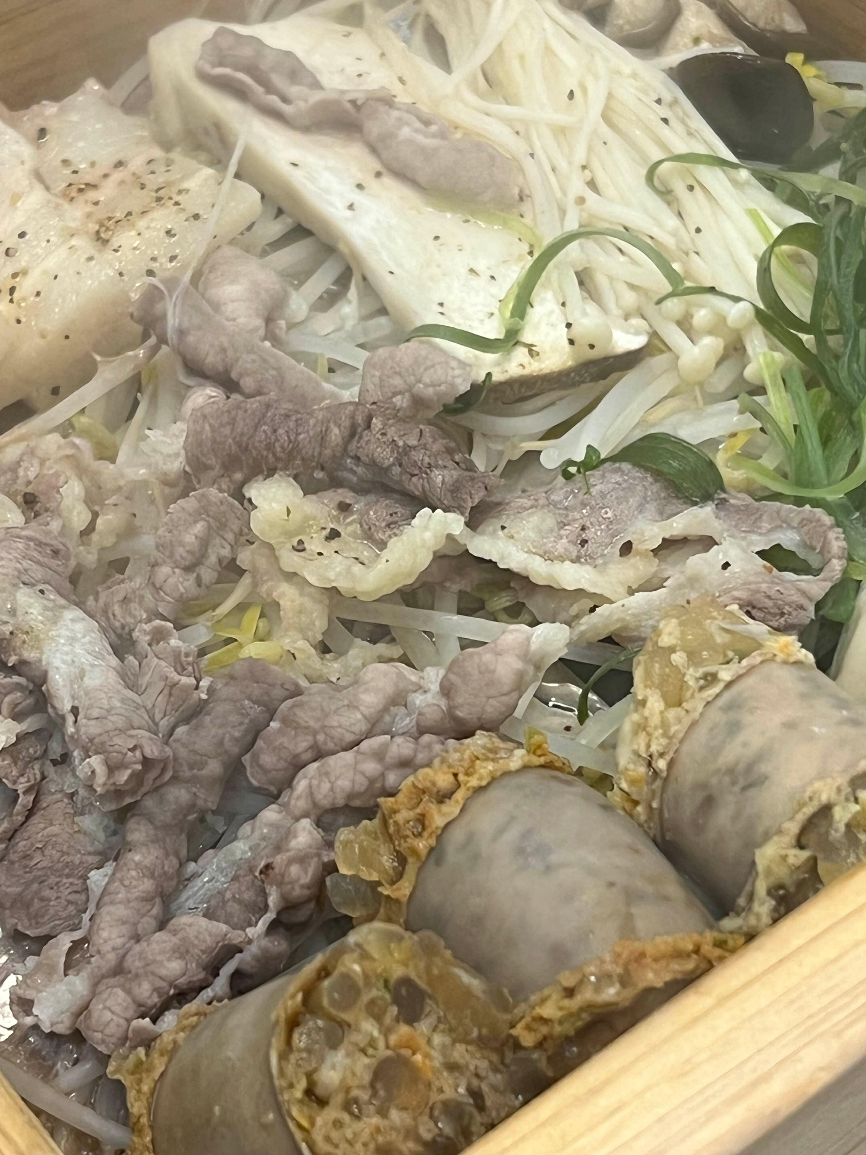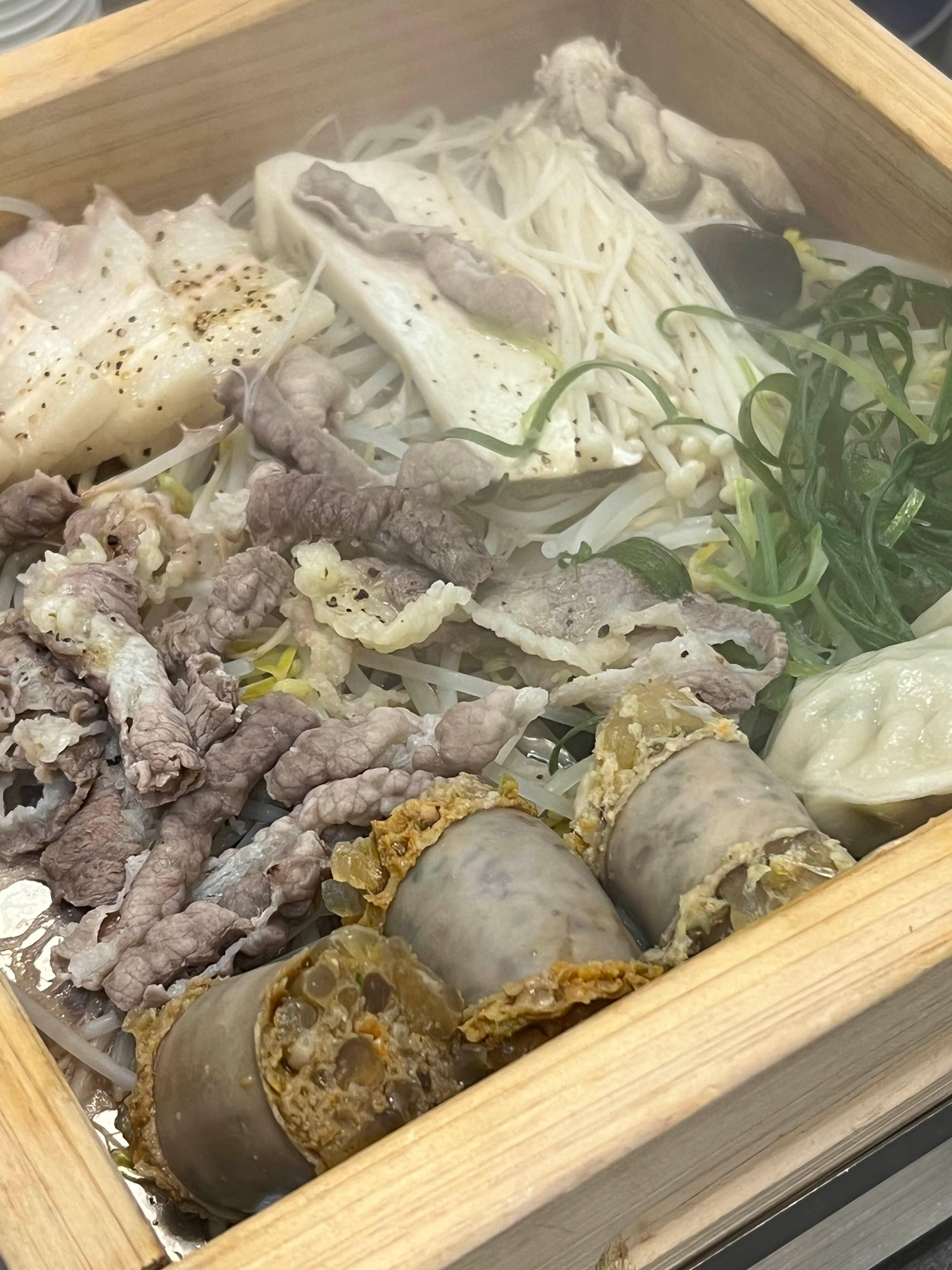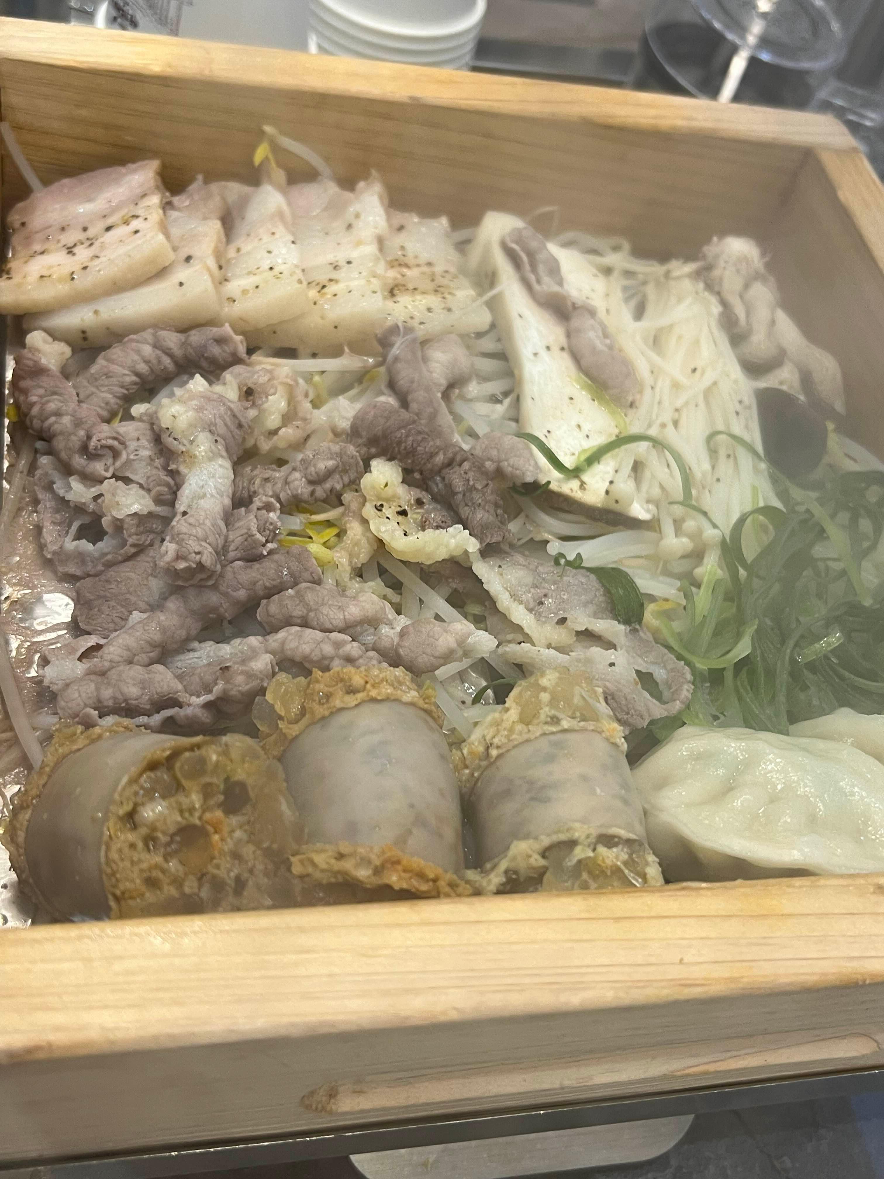 짠! 뚜껑을 여니 모듬 편백찜이 나왔는데 순대와 수육, 만두, 버섯까지 하나에 다 들어있었다. 구성 하나하나가 정말 알차고 고기 퀄리티도 정말 좋았다. 찍어먹는 소스는 마늘 베이스의 소스였는데, 찍어먹을 소스가 조금 더 다양했으면 좋았겠다라는 아쉬움은 있다. 하지만 재료 본연의 맛으로도 정말 맛있었고 보통 편백찜에서는 찾아볼 수 없는 만두와 순대까지 포함되어 있어서 만족도가 높았다.