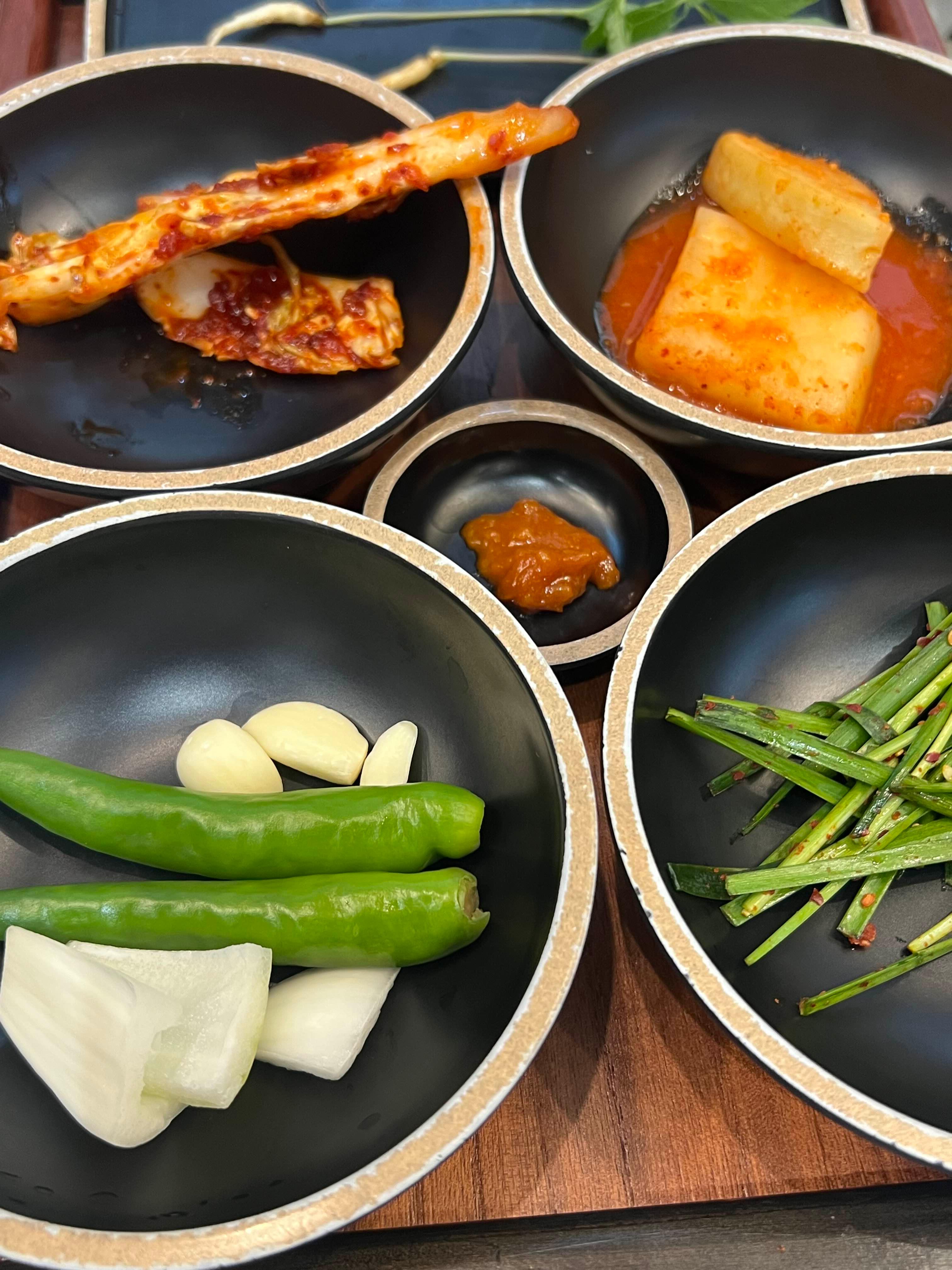 가장 먼저 기본 밑반찬이 나왔다. 신기하게 반찬으로 산삼까지 인원수에 맞게 나왔다. 김치와 고추도 적당히 간이 되어 있고 맛있었다.